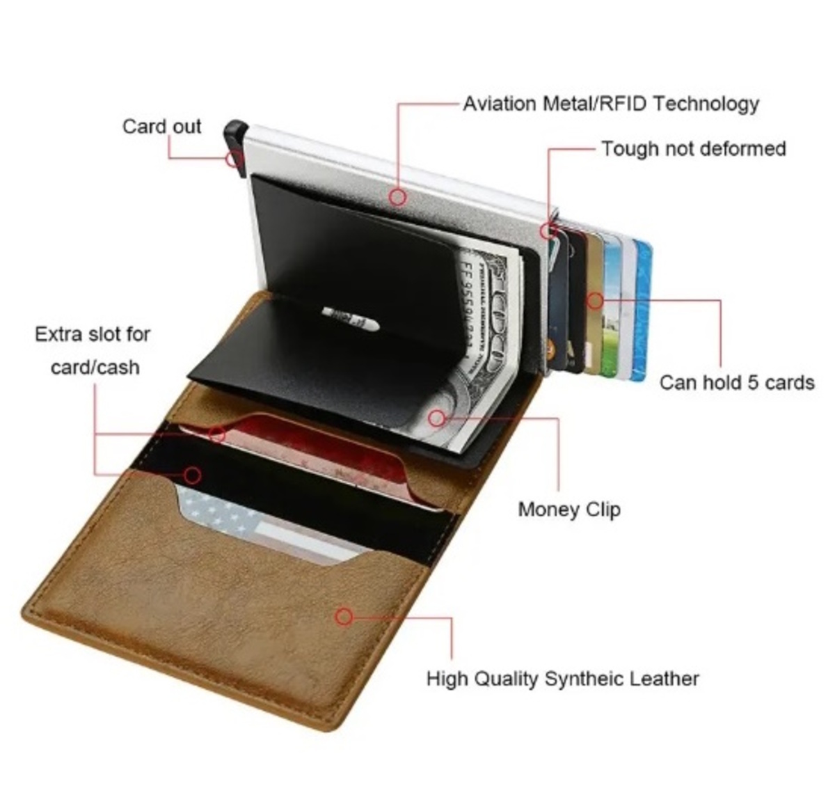 - Pouzdro vyrobené ze stínícího kovového materiálu zabraňující v komunikaci mezi čipem na kartě a okolím. Zabrání tak nechtěnému načtení karty a elektronické krádeži vašich peněz nebo dat pomocí přenosných čteček a skenerů.